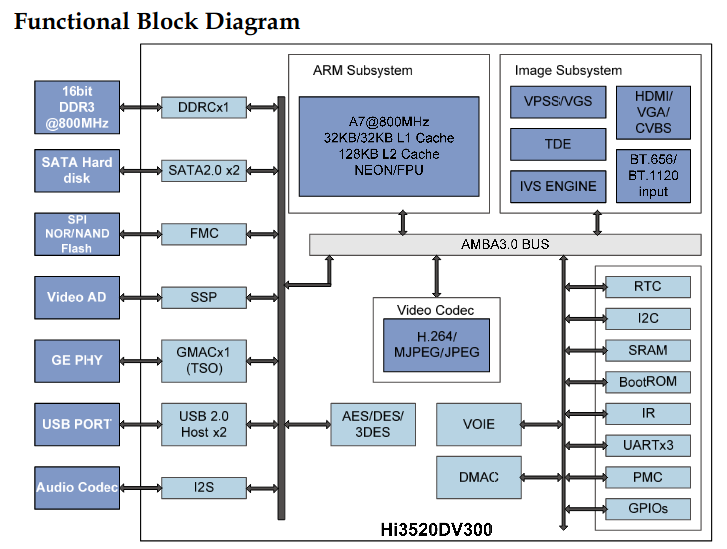 "Hi3520D V300 is a professional SoC targeted for the multi-channel HD (1080p/720p) or SD (D1/960H) DVR. Hi3520D V300 provides an ARM A7 processor, a high-performance H.264 video encoding/decoding engine, a high-performance video/graphics processing engine with various complicated graphics processing algorithms, HDMI/VGA HD outputs, and various peripheral interfaces. These features enable Hi3520D V300 to provide high-performance, high-picture-quality, and low-cost analog HD/SDI solutions for customers' products while reducing the eBOM cost"