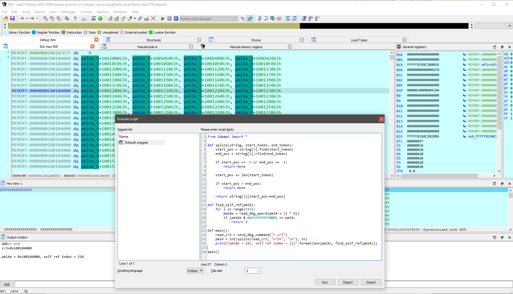 Luckily for me, Hyper-V as expected has a self referencing PML4E in all of its host PML4’s. The index of this PML4E is 510 which means the virtual address of every host PML4 is 0xFFFFFF7FBFDFE000. This PML4E can be located by using vmware’s gdb stub and IDA Pro. By placing an infinite loop in the vmexit handler hook we can break into the hypervisor's address space with IDA. We can then read CR3 to obtain the physical address of the PML4. Then using IDA we can switch the memory layout to physical memory addresses and go to the PML4 and manually inspect it ourselves.