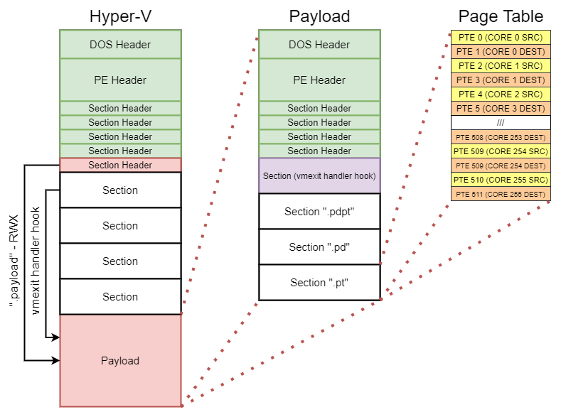 Now that the self referencing PML4E and subsequent PML4 virtual address has been discovered, one can now access and configure host virtual memory. Both AMD and Intel Hyper-V payloads insert an additional PML4E into the host PML4 which points to a set of page tables embedded inside of the payload. These page tables are allocated inside of a section with the respective names “.pdpt”, “.pd”, and “.pt”. Each logical processor is allotted two PTE’s which it can use to map source and destination pages. This allows for memory to be copied directly between two pages rather than having to go through a buffer.